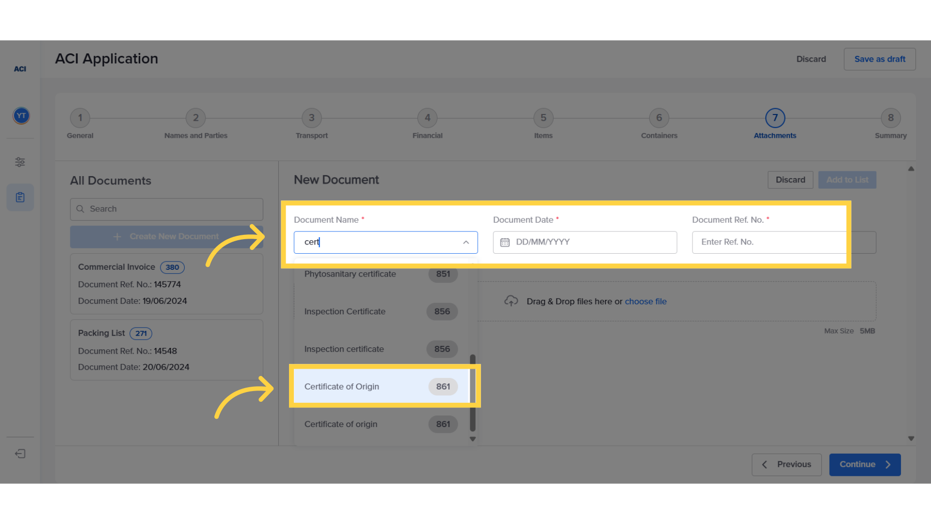 In this example, if the exporter wants to attach the Certificate of Origin, they should select the appropriate Document Type, add the document date, and provide a reference for the document.